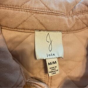 This is a quilted barn/utility style coat by the brand joie. It is a blush pink/light mauve color. The construction of this jacket is high quality. Nice, durable snaps down the front and on the pockets. It is 100% cotton. Size Medium.
