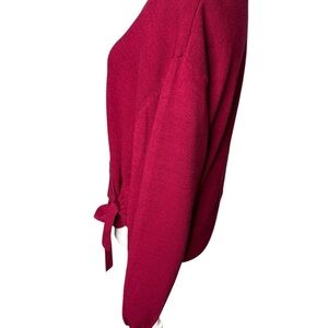 This Joie sweater features a striking V-neckline and long, slightly balloon-style sleeves, crafted in a rich red hue. The soft knit material offers a relaxed, oversized fit, perfect for cooler weather. A side tie detail at the waist adds a touch of elegance to this medium-weight sweater.