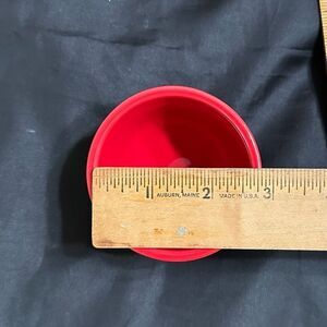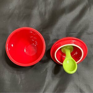 Joie Red Strawberry Shaped Jam Jar Server Container with built in spoon in lid. Rubber base helps secure it from sliding around as you spoon out your jam or jelly. Spoon part is removable for cleaning, whole thing is dishwasher safe.