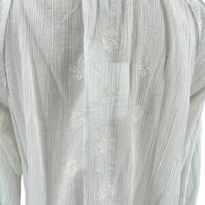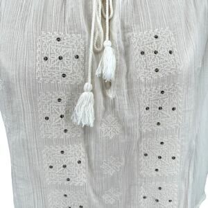 100% cotton. Keyhole front with tassel fringe trimmed tie closure. Embroidery throughout. Beaded accent. Ruching on the shoulders. Size small new with tags. Lane flat it measures approximately 20 inches armpit to armpit and the length from the top of the shoulder down the back is 26 inches.