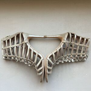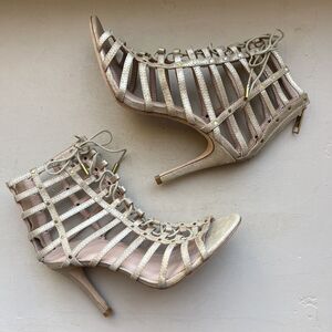 The Joie Rhoda sandal is a strappy gladiator-style shoe made of distressed metallic gold leather. It features studded accents and a high stiletto heel. The lace-up closure allows for a customizable fit. The upper material is leather, and the shoe is designed for women with a US shoe size of 7.5 - 8 and an EU shoe size of 38.