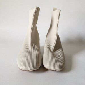 These ankle boots feature a ribbed knit upper with a sleek silhouette complemented by a 2" wooden block heel. Designed for comfort and style, they add a refined touch to any wardrobe. The pull-on design ensures ease of wear, while the neutral ivory shade makes them versatile.