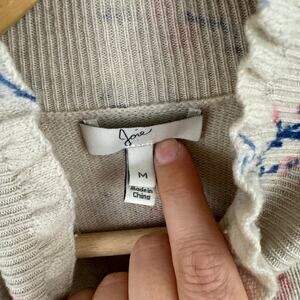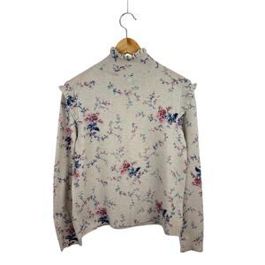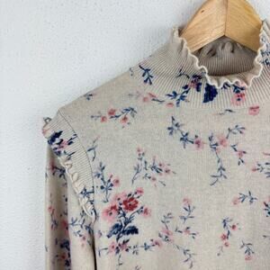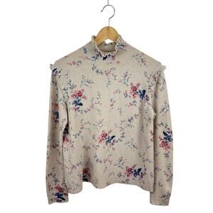 Beige with pink & blue floral print, soft wool & cashmere blend, ruffled turtleneck, size medium.
