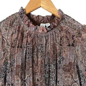 Features: high crewneck with ruffled trim, long sheer sleeves, lined bodice, smocked waist, sheer outer material with metallic accents. Color: beige/brown/dusty pink boho floral print.