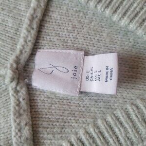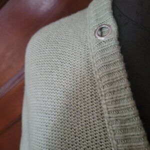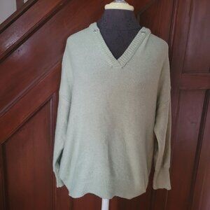 This Joie sage green knit sweater features a cozy hood and metal button accents. Crafted for comfort, it offers a relaxed fit and stylish design.