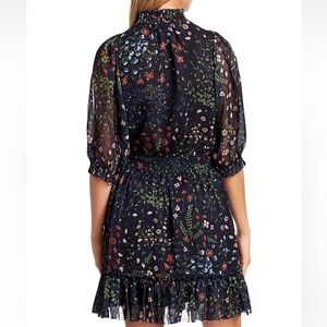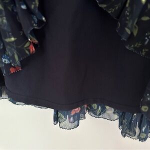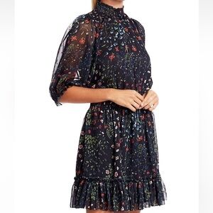Features: sheer overlay adorned with floral motif adds feminine charm to this puff sleeve dress. V neck. Elbow length puff sleeves with elasticized ruffle cuffs. Pullover. Elasticized waistband. Ruffle hem. Lined.