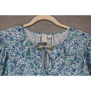 This is a Joie Short Flutter Sleeves Metallic Semi-Sheer Top that is a Paisley Print. It is a size Small/Petite. It is 100% Polyester. Laying flat, it measures: Armpit to armpit-20.5" and the Length is 23.5". It is lined. It has that Fairy style. Very pretty.