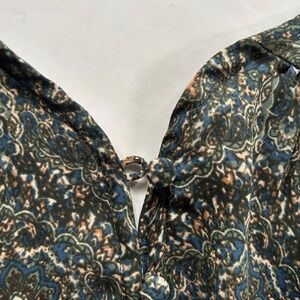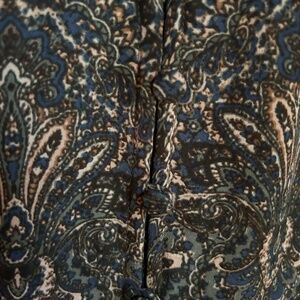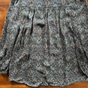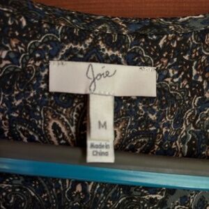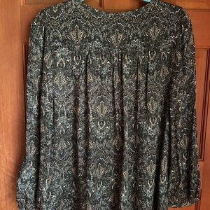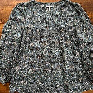 Joie 100% silk blouse. Loose/flowy with long sleeves gathered at wrist. Has fabric-covered buttons with loops, but is meant to be pulled on over head. Beautiful paisley-adjacent design of blue, sage/pine green, with a bit of gold and cream. Worn once or twice (now a little small for me). Perfect condition. Size medium.
