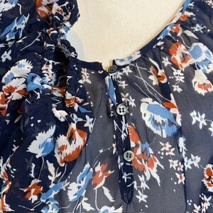 Joie Silk Floral Sheer Blouse Navy Blue Rust Button Front Wide Neck Oversized XS. Excellent condition. See photos for details and measurements. Such a pretty print for all seasons, summer, spring, fall, Sheer silk. Navy with blue, rust, white. 3/4 sleeve Pintuck neck, breezy, airy, light, feminine, vacation, beach, botanical, garden, office, business, professional,