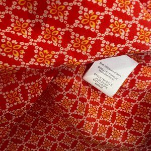 Chic red blouse with intricate pattern. Features short sleeves and tie detail. Perfect for casual or dressy occasions. 100% silk in like new condition