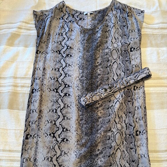 Joie, silk dress, sheath dress, tunic dress, snake print dress, black and grey, size small, form-fitted dress, flowy dress, versatile dress, snap belt, luxury dress, evening wear, casual chic, office dress, date night dress