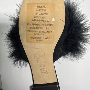 New no box. Size 37.5 or 7 Joie beautiful Slide Mani Sandal. Cushioned footbed, suede at toes and heel. Suede slide with black dyed and treated turkey feathers. 1” heel. Super Comfortable.