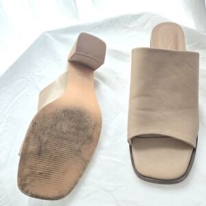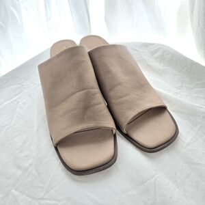 Lovely stone colored slides with genuine leather look material and wood look block heels. Heels 2 inches with a square toe. Elastic built into the shoes for a more flexible step. Comfortable, classy, and they can match a wide variety of outfits.  Order them today.