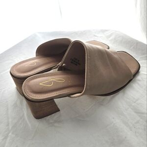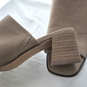 Lovely stone colored slides with genuine leather look material and wood look block heels. Heels 2 inches with a square toe. Elastic built into the shoes for a more flexible step. Comfortable, classy, and they can match a wide variety of outfits. Order them today.
