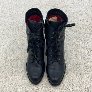 Looking for something different in your footwear collection? Check out our lace up platform boots! These stylish ankle boots are perfect for adding a touch of edge to any outfit. The black leather upper and chunky block heel give these boots a visual weight that is perfect for making a statement. Lace-Up Front and Side Zipper Closures for a Perfect Fit. Warm Vibrant Red Lining.