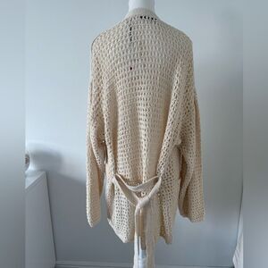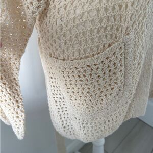 100% cotton adjustable and removable waist tie. Side patch pockets open knit crochet fabric.