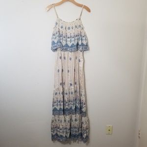 A softly colored geo print enhances the global appeal of a silken maxi dress styled with a fluttery popover bodice and tiered A-line skirt. Silvery shimmer adds a touch of big-city glam to the prairie-chic design.
