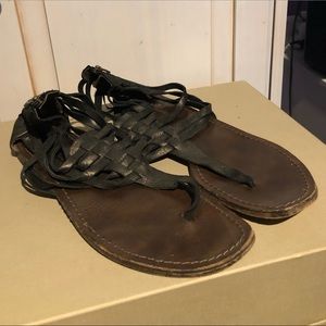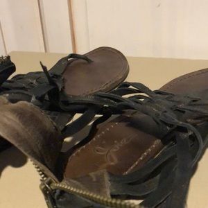 Joie suede back zip sandals. Brown suede has a metallic copper shimmer. Notice one inner strap is loose. Made in Italy. Size: 39.5