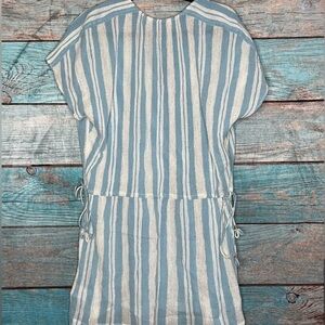 Beautiful swim cover by Joie. Size x-small. Blue & white stripes with metallic silver threads. Sparkly. Mini dress style. Cute tassel tie details. Semi-sheer. Preloved. Please see all photos for condition. Drapey fit. V-neck. Wide sleeves.