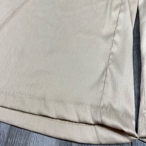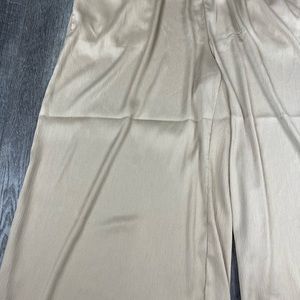Size XL. Brand new with tags. textured Tan colored oversized style flow pants. Elastic waistband. Material is a mix of polyester and spandex. Machine washable. Waist is 19 inches across. 16.5 inch front rise. 37.5 inches long with 23.5 inch inseam (measurements approximate)
