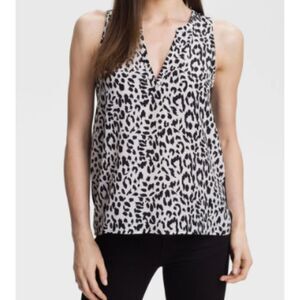 Joie Corette Black & White 100% Silk Leopard Animal Print Blouse Sleeveless Tank Sheer Back panel, v split neckline, lightweight perfect for warm summer weather.