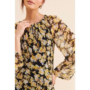 Floral midi dress w/ sheer sleeves and pleated neckline