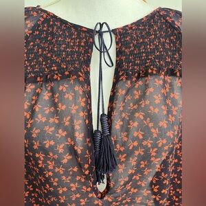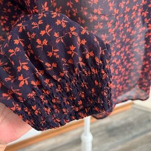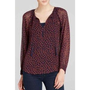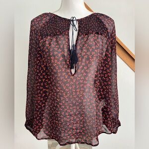 Joie Vivette Leaf Blouse Floral Sheer Silk Tassels Tie Front Navy Rust
