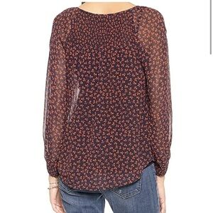Embrace nature's elegance with the Joie Vivette Peasant Blouse. Adorned in a captivating leaf floral print, its sheer silk fabric drapes gracefully, accentuated by delicate silk tassels that tie at the front. The navy and rust hues evoke a sense of autumnal charm, while smoked detailing on the neck and cuffs adds a touch of allure.