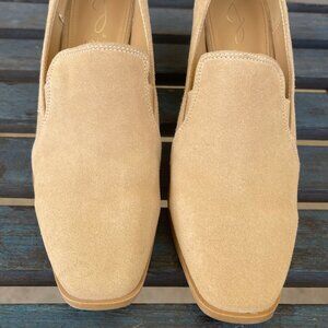 womens loafers, suede block heels, casual loafers, professional footwear, Joie loafers, slip-on shoes, beige shoes, block heel loafers, suede slip-ons, designer footwear, elegant loafers, comfortable heels, suede women's shoes