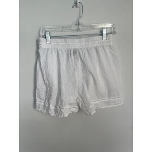 Lightweight white pull-on shorts with dot and stripe texture, tassel drawstring front, and delicate ladder lace trim. Ideal for summer or vacation wear.