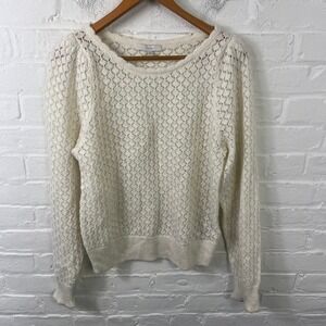 Elegant white crew neck sweater. Features intricate knit design. Perfect for layering.