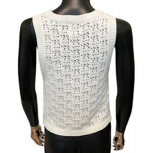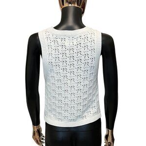 This sleeveless knit vest features a softly structured scoop neckline, ribbed trim, and a straight hem for easy styling. The back showcases an intricate open-knit pattern that adds visual interest and dimension while remaining wearable and versatile. New with original tags attached. Measurements are provided in the photos for best fit reference.