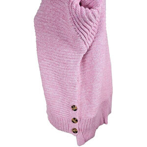 This is a Joie brand women's sweater in a size L. The sweater is a pink marled knit pullover with a scoop neckline and long sleeves. It features button accents and a relaxed fit. The sweater is made of a cotton blend material that is breathable and stretchy. It is machine washable and has a tight-knit fabric type. The sweater is perfect for travel, casual wear, or workwear. It has a modern theme and is not vintage. The garment care instructions are included.