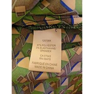 Style: sleeveless blouse, high neckline, button down front with a concealed placket, green blue white & black geometric design, round bottom, spring/summer