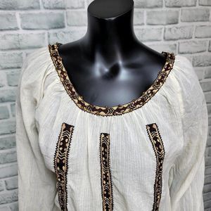 Details: Off White Gauzy Sheer Cotton Embroidered Boho Flowy Top Long Sleeve