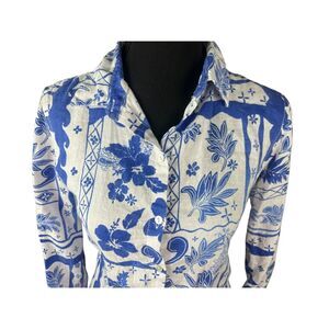 Joie Womens Small 100% Linen Shirt Top Blue White Tropical Floral button up