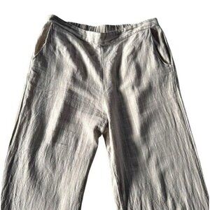 Joie women's wide leg linen pants. Pants are done in a light cream color with white stripe accents. They have a high rise pull on waist with a wide leg. Pants are made of a linen viscose blend and are a woman's size large. Very Lagenlook. These are perfect for a hot summer day or for travel!