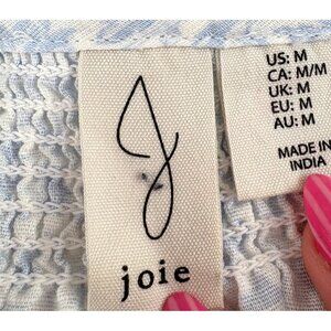 This elegant Joie blouse features a light blue floral pattern with a boho vibe. It's perfect for casual or semi-formal occasions, offering a comfortable fit with its pullover design.