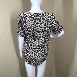 A leopard-spotted V-neck top, with multiple back box pleats to enhance its fluidity. Front is slightly shorter than back. New without tags.