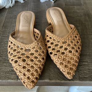 Step into style with these woven tan slip-on mules. Perfect for any casual outing, these shoes offer both comfort and elegance.