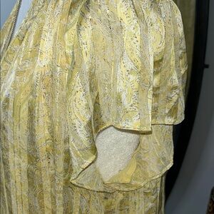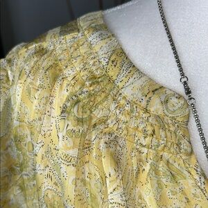This Joie blouse features a relaxed fit with a V-neckline and short flutter sleeves, crafted in a semi-sheer yellow fabric with a subtle sheen. The embellished design adds a touch of elegance, making it versatile for both casual and dressy occasions.