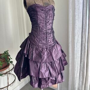 vintage plum dress, tiered ruffle party dress, 80s prom style, sweetheart neckline gown, vintage eveningwear, puff skirt dress, ruched bodice dress, retro glamour fashion, iridescent taffeta dress, vintage formal style