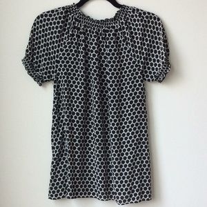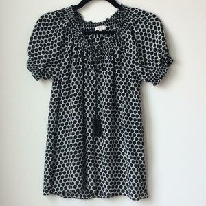 Black and white printed short sleeve blouse from Joie. Front keyhole with tasseled self tie. Round neck.