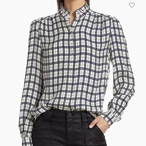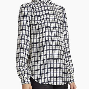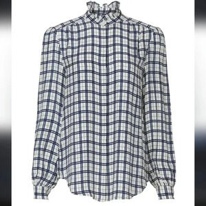 Lightweight viscose blouse in a tailored silhouette softened with a ruffled collar and pleated yoke.