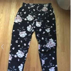 size S. Black silk with pink rose pattern. 4 pockets, 2 on the hip seam and 2 back with button closure. 100% silk. Excellent used condition.