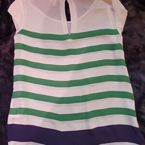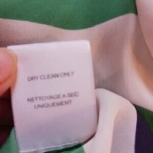 100% silk striped cap flutter sleeved blouse has back neck key hole single button closure. Relaxed/ Oversized fit. Flaw: there is a run that goes the the entire front ( last photo) but barely noticeable. Otherwise excellent condition.