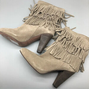 Excellent used condition light tan / beige heeled boots with 3 long fringe layers of suede leather at the top of the boot. Stacked wood heel. Rounded almond toe.