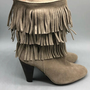 Joie tan fringe 3 tier fringe heeled booties
