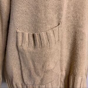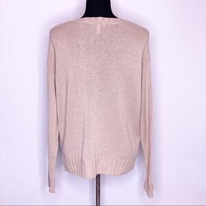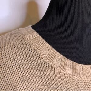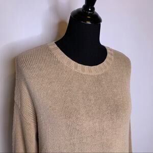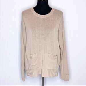 Joie tan wool cashmere sweater. Pullover style with crew neckline. Ribbed collar hemline and sleeve cuffs. Side slit hemline. Double front open pockets. Size M. Excellent preowned conditon. A couple of tiny snags as shown. A tiny spot on sleeve as shown. 90% wool 10% cashmere.