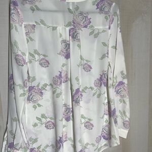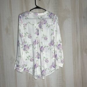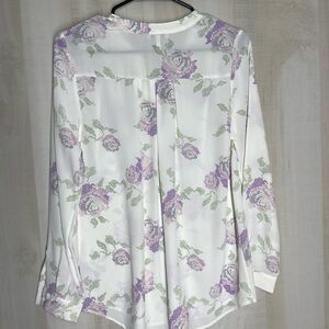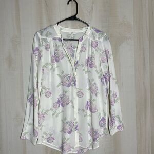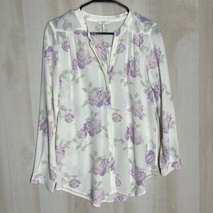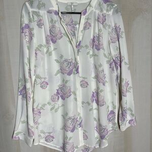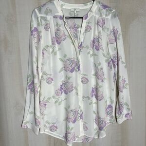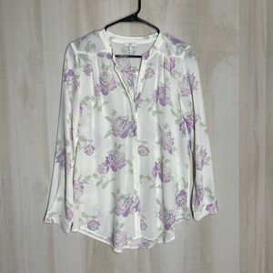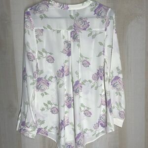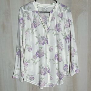 Joie white silk blouse with lavender purple flowers, long sleeve,‎ size XS